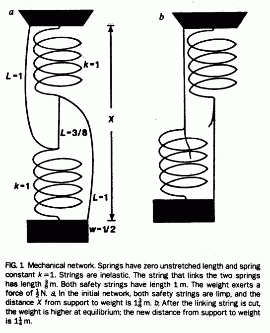I once saw a particularly interesting physical manifestation of this paradox (performed I believe by Chris Bishop), where a weight was suspended from two partially elastic ropes, both attached to the ceiling. These two suspending ropes were connected in the middle by another rope. The weight was analogous to the destination, and the ropes were the roads, with the total duration of the route being analogous to the distance of the weight from the ceiling. When we removed the central road (by cutting the connecting rope), the weight paradoxically went up instead of down.